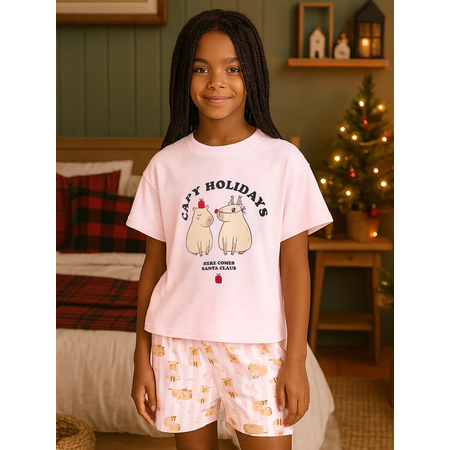Пижама детская для девочки с шортами выполнена из мягкого хлопка, благодаря чему ребенку будет комфортно в течение всей ночи. Такую вещь можно использовать как удобную одежду для дома или прогулок в летний теплый сезон. Пижама включает футболку и шортики, что особенно удобно для малышей в садик и дома, а для подростков станет стильным вариантом для вечерних посиделок. Трикотажный материал свободно облегает тело, не стесняет движений и подходит даже на маленький рост. Костюм отличается легким уходом и практичностью, ведь хлопковый состав гигроскопичный и дышащий. Пижамка прекрасно подходит для сна, ее приятная фактура не раздражает кожу ребенка, а забавный принт делает комплект милым и нарядным.