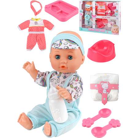 В наборе: подгузник (13х12 см.), горшок (10.5х10.5 см.), бутылочка (10х3 см.), тарелка (11х9 см.), ложка (8х3 см.), вилка (8х3 см.), одежда.