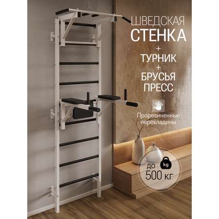 Турник навесной и брусья пресс на шведскую стенку имеют специальную конструкцию со сварным креплением в форме петли из мощного металлического профиля. Благодаря этому они выдерживают огромные нагрузки и подтягивание с рывками. Устанавливаются на подходящую по росту перекладину.