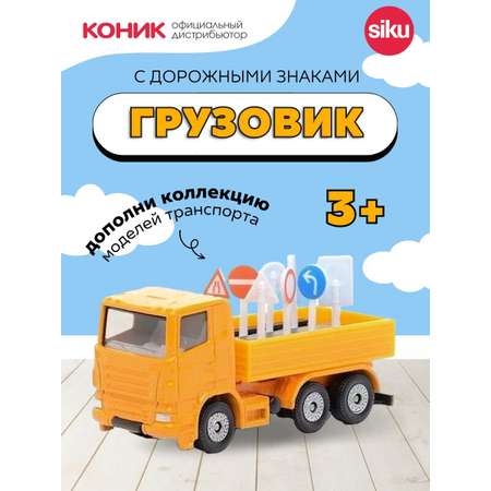 Модель выполнена из металла с элементами из пластика; прорезиненные колеса крутятся. В комплект к грузовику входят восемь дорожных знаков.