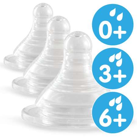 В комплект входит бутылочка с широким горлышком Ramili Baby, соска медленный поток для детей с рождения 0+, дополнительная соска средний поток для детей от 3 месяцев и дополнительная соска быстрый поток для детей от 6 месяцев.
