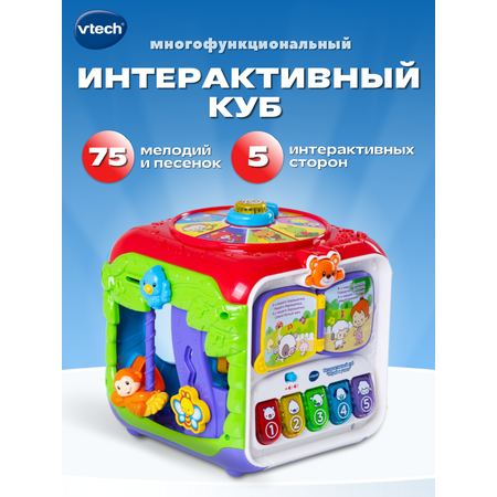Возможности для игры и исследований с пятью сторонами интерактивного куба. Ребенок будет передвигать, нажимать, вращать, крутить элементы куба, одновременно изучая цвета, цифры, животных и многое другое.