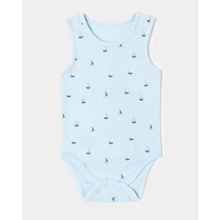 Голубая боди-майка для мальчика Моя Горошинка, декорированная принтом с парусниками.