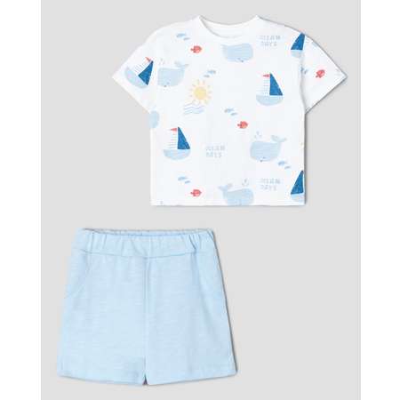 Летний комплект для мальчика Моя Горошинка из однотонных голубых шорт и белой футболки с цветным принтом.