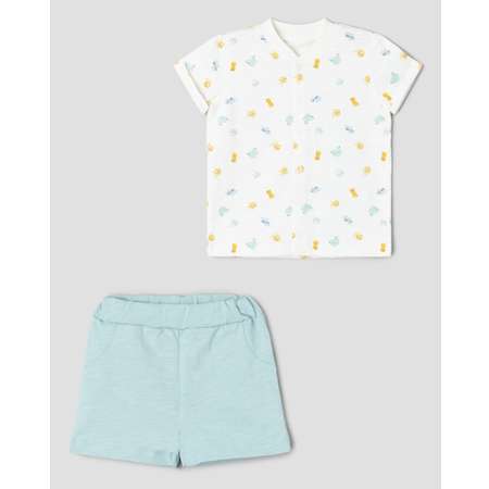 Летний комплект для мальчика Моя Горошинка из однотонных мятных шорт и рубашки с цветным принтом.