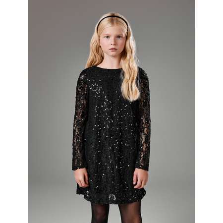 Черное платье для девочки-подростка выполнено из кружева с пайетками, которое придаст образу волшебного шарма и мягкого блеска. Нарядное платье дополнено мягкой трикотажной подкладке, которая делает ношение комфортным. Черное кружевное платье чуть расширяющегося к низу силуэта, диной до колена позволяет легко двигаться, что особенно важно для праздничных конкурсов и танцев. Платье с длинными рукавами, присборенными у плеча, которые делают его подходящим для разных случаев. На спинке расположена застежка на петлю и пуговицу, которая облегчает одевание. Детское кружевное платье станет утонченным выбором для новогодней вечеринки, дня рождения или других праздников.