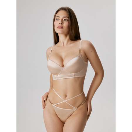 Женский бюстгальтер T-shirt без пуш-ап и декоративными вставками станет утонченным дополнением к гардеробу девушки. Бюстгальтер выполнен из блестящего эластичного полотна, что придает ему стильный вид. Модель на косточках с поролоном обеспечивает надежную поддержку груди и подчеркивает её естественную форму. Спереди на бретели пришита декоративная золотистая вставка с названием бренда, что придает изделию оригинальности и блеска. Несъемные бретели регулируются по длине, позволяя подогнать модель под параметры фигуры. Бюстгальтер застегивается на четыре ряда крючков и петель. Модель представлена в двух цветах: черном и бежевом. Комбинируйте бюстгальтер с трусами (31204122433), чтобы создать утонченный комплект нижнего белья. 31204111464 31204111464