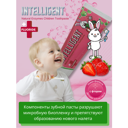 Детская зубная паста со фтором (1000 ppm) INTELLIGENT Natural Enzymes Children ( не пенящаяся - без SLS ),со вкусом клубники разработана с учетом особенностей ухода за зубами и деснами детей разного возраста, для поддержания здоровья зубов. Натуральная, не пенящаяся, детская зубная паста INTELLIGENT ( Интеллигент ) Natural Enzymes, обладает антибактериальным , противовоспалительным и отбеливающим действием. Бережно и безопасно защищает зубы и полость рта ребенка. Обеспечивает защиту от кариеса, налета, бактерий, грибков, остатков пищи, за счет натуральных, очищающих активных ферментов слюны: амилазы, лизоцима, глюкозооксидазы, лактопероксидазы и лактоферрина, которые эффективно помогают отбеливать детские зубы. Вкус и аромат пасты очень нежные, что подойдет для ребенка любого возраста. Жемчужная пудра ( кальций, аминокислоты, микроэлементы ) для укрепления эмали и придания блеска зубам. Не содержит сахара и моющих компонентов ( SLS ). Благодаря методу сухой чистки, повышается секреция слюны и восстанавливается микрофлора полости рта. Подходит для ежедневного использования. Для максимально эффекта, нанесите небольшое количество зубной пасты на сухую зубную щетку, без предварительного ополаскивания полости рта водой. Рекомендуется чистить не менее 3 минут и двух раз в день. Гигиена и ухода за полостью рта, очень важны, для здоровья ребенка, с первых лет жизни (3+ )