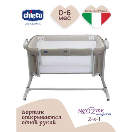 Детская кроватка Chicco Next2Me Magic Evo с рождения до 6 месяцев Desert Taupe прямоугольная, без маятника