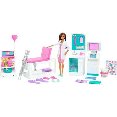 Откройте для себя мир веселья и заботы с игровым набором Барби “Клиника”! Когда девочки играют с Барби, они представляют себе, кем могут стать, например, врачом в клинике! В наборе есть кукла-врач Барби и 4 игровые зоны: медицинский пункт, стол для осмотра, рентгеновский аппарат и сувенирный магазин. Дети могут делать слепки рук и ног для куклы-пациента (продается отдельно) из пластичной массы розового, фиолетового или белого цвета, а также делать из нее бинты с помощью специального устройства. Для большей реалистичности некоторые аксессуары из набора можно закрепить в руке Барби. Кукла не может стоять без опоры. Цвета и дизайн могут отличаться от изображений.