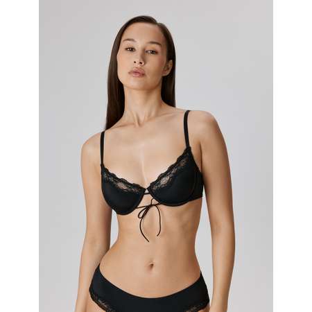 Женский бюстгальтер-вайер без поролона с завязкой выполнен из эластичного материала и узкого кружева, которые придают изделию стильный и элегантный вид. Модель на косточках с мягкой чашкой обеспечивает необходимую поддержку груди. По линии декольте расположено узкое кружево, которое придает нежности и утонченности. Спереди бюстгальтер дополнен функциональной завязкой для акцента. Несъемные бретели регулируются по длине, позволяя подогнать модель под индивидуальные параметры. Застежка в виде двойного ряда крючков и петель надежно фиксирует изделие. Стилизуйте черный бюстгальтер с трусами-боксерами (31204122264), чтобы собрать притягательный комплект нижнего белья.