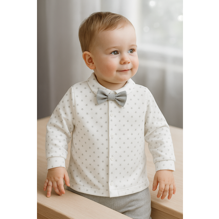 Трикотажная рубашка с длинным рукавом со звездочками — идеальный выбор для ребенка на любой праздник. Эта детская одежда создана из мягкого хлопка, обеспечивая комфорт и уют. Ткань рубашки для мальчика - интерлок, гипоаллергенный "дышащий" материал. Рубашка для мальчика, идеально подойдет для утренника, детского праздника, дня рождения, на новогодние праздники, а также на любое торжественное мероприятие и для повседневной носки. Бабочка у рубашки съемная на резинке. Классическая форма и отложной воротник придают рубашке стильный вид, который подходит для праздничных вечеринок, деловых встреч или просто прогулок по городу. Легкие кнопки позволят быстро одеть малыша и сохранить аккуратный вид.
