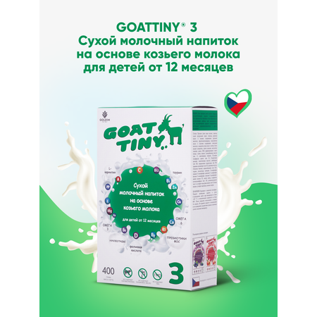 Сухой молочный напиток нового поколения GOATTINY 3 создан при помощи технологии комбинирования козьего (основа) и овечьего молока. Напиток специально разработан для питания детей с 12 до 18 месяцев в качестве замены цельного коровьего, козьего молока и других видов неадаптированных молочных продуктов.