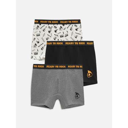 Набор из 3-х пар детских трусов-боксеров для мальчика — это практичный выбор для бельевого гардероба. Изделия выполнены из мягкой трикотажной ткани, которая обеспечивает комфортное повседневное ношение. По линии талии расположена широкая жаккардовая резинка с надписью "READY TO ROCK" англ. - "Готов к року", которая надежно и удобно садится на разные типы фигуры, не сдавливая и не вызывая дискомфорта. Ластовица выполнена из 100%-ного хлопка, который делает ношение еще удобнее. В сет входит одна пара трусов серого цвета, одна с принтом и надписями "HARD ROCK | COOL" англ. - "Тяжелый рок | Клёво" и одна черная. Сет станет отличным решением для повседневного ношения.