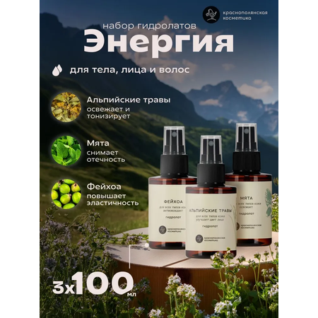 Познакомьтесь с набором гидролатов "Энергия" от КРАСНОПОЛЯНСКОЙ КОСМЕТИКИ – настоящим кладезем натуральных компонентов для вашей красоты! Этот набор – идеальный выбор для тех, кто ценит органическую косметику и заботится о своем здоровье. В его состав входят три уникальных гидролата: освежающий гидролат фейхоа, бодрящий гидролат альпийских трав и успокаивающий гидролат мяты. Каждый из них обладает своими уникальными свойствами, которые в комплексе дарят вашей коже невероятное увлажнение, питание и эластичность. Гидролат фейхоа, богатый витаминами и антиоксидантами, поможет снять отечность и придать коже сияние. Гидролат альпийских трав тонизирует и освежает, а гидролат мяты успокаивает и снимает раздражение. Этот набор – настоящий must-have для всех типов кожи, в том числе для сухой и чувствительной. Используйте его для лица, волос, шеи и декольте, чтобы почувствовать всю силу природы. Натуральные гидролаты КРАСНОПОЛЯНСКОЙ КОСМЕТИКИ – это не просто косметика, это забота о себе и своем здоровье.