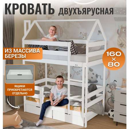 Кровать двухъярусная детская 160х80 — эта модель домик, выполнена из массива березы, идеально подходит для детской комнаты. Кровать детская деревянная легко и быстро собирается. Дерево березы крепкое и прочное, окрас не теряет яркость, что превосходит по качествам другие массивы, например, сосну.