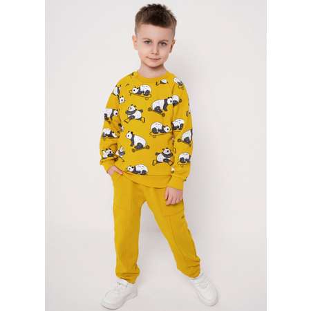 Детский спортивный костюм горчичного цвета из футера двунитки с начесом, украшенный принтом панд, для мальчиков и девочек, размеры 92-110.