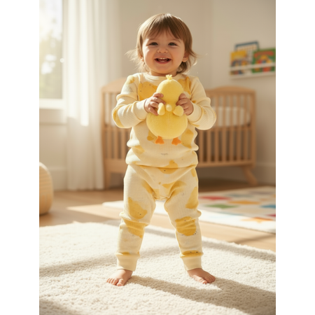 Ваш малыш спит крепким и здоровым сном в уютной и дышащей пижаме, чувствуя себя комфортно и защищенно. Утро начинается с улыбок, а милый дизайн с утятами делает процесс одевания веселым и приятным. Вы спокойны за его нежную кожу благодаря натуральному составу.