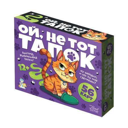 Настольная игра «Ой, не тот тапок» — это азартная и весёлая игра, в которой вам предстоит ловко избавляться от карт. Котик заскучал и устроил хаос! По всему дому разбросаны тапки, потерявшие свои пары, а один из них превратился в тот самый проблемный тапок ... Кто останется с этим подарком? Проверь свою удачу и ловкость!