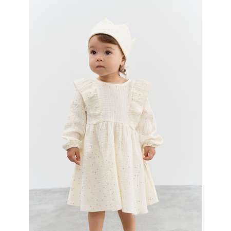 Летящее платье для девочек из нежного муслина. Комфортный крой для свободы движений. Длинные рукава с игривыми крылышками. Платье для девочки с эластичной резинкой позволяет легко собрать рукава для мытья рук или занятий творчеством. Пышная юбка со сборкой. Застежка на кнопки сзади для легкости переодевания.