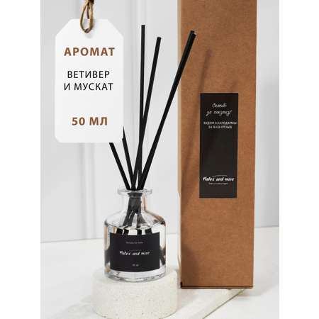 Диффузор для дома с палочками Ветивер и мускат. Ветивер и мускат создают атмосферу тайны и загадки в доме.Этот аромат создан для тех, кто ценит качество, стиль и уют в своем доме. Древесный и слегка пряный аромат, который придает атмосфере натуральность и теплоту. Мускат же добавляет этому букету нежность и сладость, создавая гармоничное сочетание, которое не оставит вас равнодушными. Верхние ноты: табак, бергамот, шалфей, средние ноты: ветивер, мирра, чёрный перец, нижние ноты: мускатный орех, бобы тонка. Объем флакона 50 мл, диффузор сделан из премиальных элементов: база MMB - 70%, отдушка - 30% (производство США), которые делают аромат в меру ярким и стойким. Перед использованием рекомендуется встряхнуть флакон. Установить диффузор в месте где хорошая циркуляция воздуха, но нет сквозняка. Добавьте палочки, начните с 2-3 штук (в комплекте 6 палочек), аромат появится не сразу, палочки должны напитаться. Интенсивность аромата можно регулировать добавлением палочек. Также каждые 2-3 дня палочки нужно переворачивать. Срок службы диффузора - до 12 недель, площадь звучания аромата до 40 м2, данные показатели напрямую зависят от количества установленных палочек. "Plates and more" предлагает широкий выбор ароматов, от свежих цитрусовых и бергамота до теплых нот ванили и корицы. Вы сможете подобрать тот аромат, который подходит именно вам и создаст уникальную атмосферу в вашем доме. Каждый диффузор изготовлен из высококачественных материалов производства Франции и США. Неотразимый дизайн, качественные материалы и изысканные ароматы делают диффузоры "Plates and more" идеальным выбором для тех, кто ценит красоту и комфорт в каждой мелочи. Погрузитесь в мир неповторимых ароматов с нашими премиальными диффузорами и создайте уютную атмосферу в своем доме.