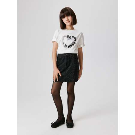 Юбка со стразами для девочки — это стильная модель для повседневных и праздничных образов. Черная джинсовая юбка изготовлена из натурального хлопкового денима, который прекрасно сохраняет форму и делает ношение комфортным. Пояс с внутренней эластичной лентой для регулировки объема по линии талии позволяет подогнать изделие под индивидуальные параметры ребенка. Вдоль пояса нашиты шлевки для ремня, которые позволят подчеркнуть образ с помощью любимого аксессуара. Модель застегивается на молнию и пуговицу, что обеспечивает быстрое и легкое одевание. Джинсовая юбка выше колена носится с комфортом и позволяет создавать удобные образы на каждый день. Главная дизайнерская деталь модели — расположенная спереди аппликация из стразов, которые добавляют сияния и блеска (спинка без стразов). Изделие с пятью карманами: двумя боковыми, маленьким накладным для мелочи и двумя накладными сзади. Джинсовая юбка со стразами будет легко сочетаться с футболкой (20240510039) и балетками.