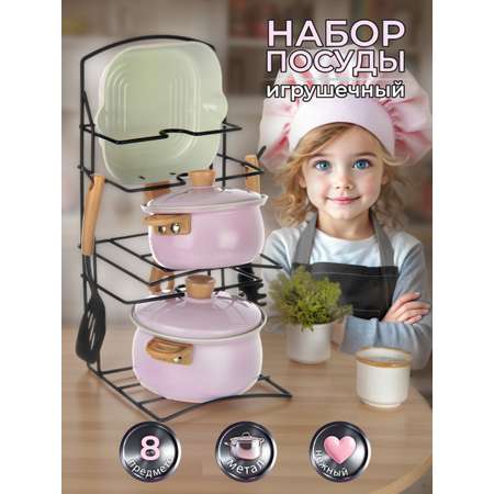 В наборе подставка, большая кастрюля с крышкой, маленькая игрушечная кастрюля с крышкой, сковорода гриль, 2 кухонных инструмента.