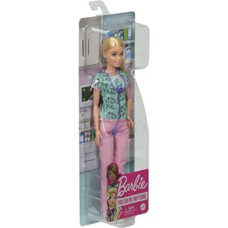 Барби высотой около 30 см одета в униформу медсестры с принтом и розовые брюки