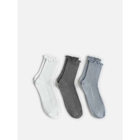 Набор из 3-х пар детских носков для девочки — это стильное и практичное дополнение к гардеробу маленькой модницы. Блестящие носки в рубчик выполнены из высококачественной хлопковой пряжи, которая обеспечивает комфорт, а добавление нити люрекса придает им эффектное сияние. Высокие носки с волнообразным краем дополнят элегантный и милый образ. В комплект входит одна пара белых носков, одна голубых и одна серых, что позволяет разнообразить повседневный стиль и сочетать их с разной одеждой. Оригинальные и необычные, носки сохраняют привлекательный внешний вид после многократных стирок и идеально подходят для активных девочек, любящих яркие и эффектные образы.