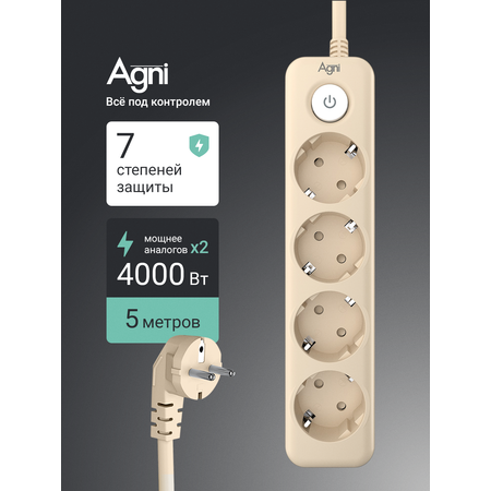 4 розетки: удлинитель Agni оснащен четырьмя розетками, что позволяет вам подключать несколько устройств одновременно и комфортно использовать их в одном месте.