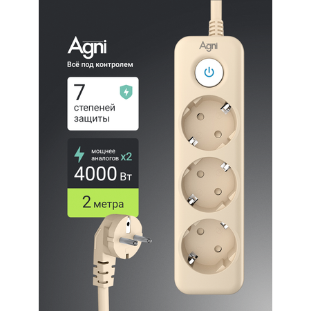 Три розетки: удлинитель Agni оснащен тремя розетками, что позволяет вам подключать несколько устройств одновременно и комфортно использовать их в одном месте.