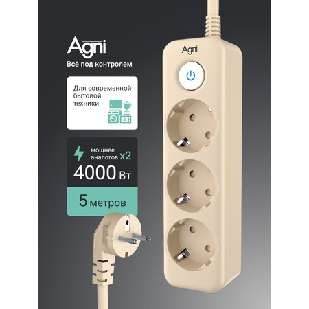Три розетки: удлинитель Agni оснащен тремя розетками, что позволяет вам подключать несколько устройств одновременно и комфортно использовать их в одном месте.