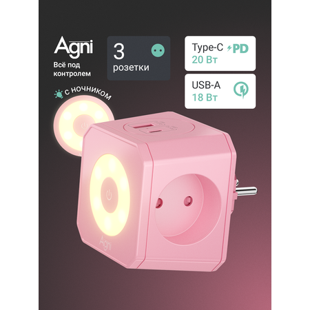 Разветвитель для розетки AGNI TP-WJ2U3E-L с ночником специально разработан командой AGNI, чтобы с мягким LED свечением было комфортно спать даже детям, а также его было легко найти в темноте.