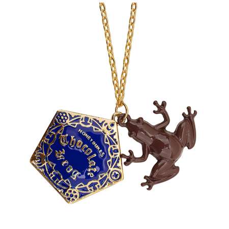 На цепочке элегантно расположились миниатюрные копии знаменитой Шоколадной лягушки и её картонной коробочки. Лягушка цвета молочного шоколада словно только что выпрыгнула из волшебной упаковки, а коробочка выполнена в синем цвете с блестящими золотистыми деталями — всё как в фильме.