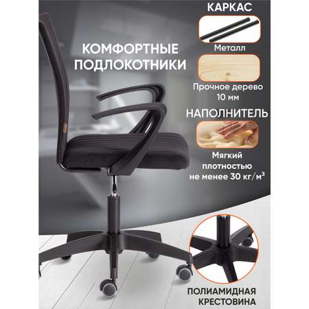 Практичное компьютерное кресло идеально подойдет для создания комфортного рабочего пространства в доме или офисе. 5-лучевая полиамидная крестовина диаметром 600 мм надежна, прочна, долговечна. Компьютерное кресло регулируется по высоте при помощи газлифта 3 класса с ходом 100 мм, что позволяет настроить его исходя из анатомических особенностей владельца. Высококачественные ролики дополнительно прорезинены для предотвращения повреждения напольного покрытия. Отлично подходят для использования на паркете и ламинате. Диаметр штока ролика – 11 мм. Эргономичная спинка и удобное сиденье с мягким наполнителем из пенополиуретана плотностью не менее 30 кг/м3 легко подстраиваются под контуры тела, не деформируются со временем. Фиксированные пластиковые подлокотники помогут снизить нагрузку на шею и спину, уменьшат усталость и напряжение в позвоночнике, повысят производительность на рабочем месте. Оригинальная модель обита флоком с водоотталкивающей пропиткой 320г/м2. Такой материал не требует сложного ухода, устойчив к механическим повреждениям, приятен на ощупь. Ткань, используемая при изготовлении кресла, выдерживает до 50 000 циклов на истирание по Мартиндейлу. Стильное компьютерное кресло черного цвета отличается элегантностью, практичностью и привлекательностью, удивит владельца своей функциональностью, надежностью и долгим сроком службы. Модель поставляется в разобранном виде. Необходима простая сборка по прилагаемой инструкции. Максимальная нагрузка 100 кг.