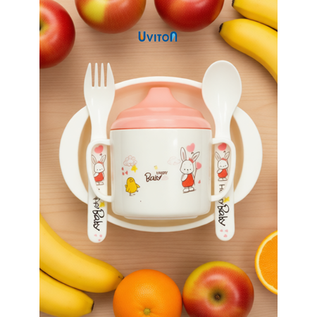 поильник 1шт,тарелочка 1шт, ложечка и вилочка.
