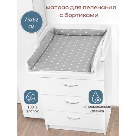 Мягкий матрасик для пеленания и переодевания, гигиенических процедур, принятия воздушных ванн, подготовки к купанию или массажу предназначен для детей с рождения 0+. Размер пеленальной поверхности 68х47 см, размер с бортиками 75х62 см., ширина бортиков 7,5 см. По нормам ГОСТ допускается погрешность в длине и ширине изделия +/-5 см. Водонепроницаемое покрытие прямоугольной формы состоит из наполнителя - холкон 35 мм., плотной медицинской клеенки с одной стороны, 100 % хлопок -бязь с другой. Чехол на матрасе двухсторонний , с одной стороны непромокаемая клеенка, с другой ткань ( 100 % хлопок, бязь). Пеленальный матрас (толщина 2,5 см) по размеру подходит для размещения на детском комоде шириной 60 см. Легкая накладка - пеленальник может располагаться на любой горизонтальной поверхности: на столе, обычном комоде, тумбе, родительской кровати, диване или другой удобной мебели. В отличие от пеленального комодика накладка удобна для переноски. Портативный матрац с водонепроницаемым покрытием удобно использовать для смены памперсов или подгузников новорожденному, или младенцу. Практичное изделие предназначено для новорождённых, малышей с рождения и детей до годика. Аксессуар из мягкого материала с защитной клеенкой можно использовать как дорожный матрас, удобный коврик для крохи, брать его с собой в поездки и путешествия на автомобиле. Располагая ребенка на матрасике, обращайте внимание на необходимость защиты в виде бортиков или контролируйте его нахождение неотрывно. Изделие сертифицировано в соответствии со стандартами качества, гипоаллергенно, в нем отсутствуют токсичные вещества, оно безопасно для детской кожи. Компактный матрасик легок и прост в уходе и чистке, его достаточно протирать тряпочкой с мыльным раствором и сушить естественным способом или вытирать. Произведено в России.