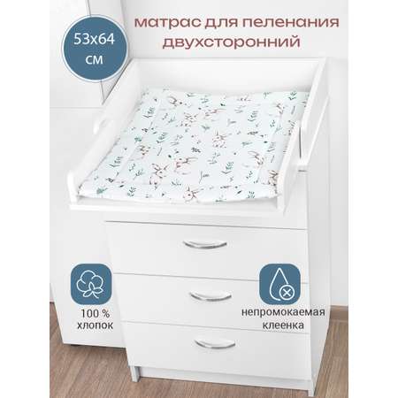 Мягкий матрасик для пеленания и переодевания, гигиенических процедур, принятия воздушных ванн, подготовки к купанию или массажу предназначен для детей с рождения 0+. Размер 53х64 см, по нормам ГОСТ допускается погрешность в длине и ширине изделия +/-5 см. Водонепроницаемое покрытие прямоугольной формы состоит из наполнителя - холкон 35 мм., плотной медицинской клеенки с одной стороны, 100 % хлопок -бязь с другой. Чехол на матрасе двухсторонний , с одной стороны непромокаемая клеенка, с другой ткань ( 100 % хлопок, бязь). Пеленальный матрас (толщина 2,5 см) по размеру подходит для размещения на детском комоде шириной 60 см. Легкая накладка - пеленальник может располагаться на любой горизонтальной поверхности: на столе, обычном комоде, тумбе, родительской кровати, диване или другой удобной мебели. В отличие от пеленального комодика накладка удобна для переноски. Портативный матрац с водонепроницаемым покрытием удобно использовать для смены памперсов или подгузников новорожденному или младенцу. Практичное изделие предназначено для новорожденых, малышей с рождения и детей до годика. Аксессуар из мягкого материала с защитной клеенкой можно использовать как дорожный матрас, удобный коврик для крохи, брать его с собой в поездки и путешествия на автомобиле. Располагая ребенка на матрасике, обращайте внимание на необходимость защиты в виде бортиков или контролируйте его нахождение неотрывно. Изделие сертифицировано в соответствии со стандартами качества, гипоаллергенно, в нем отсутствуют токсичные вещества, оно безопасно для детской кожи. Компактный матрасик легок и прост в уходе и чистке, его достаточно протирать тряпочкой с мыльным раствором и сушить естественным способом или вытирать. Для избежания деформации, рекомендуется ручная стирка, ручной отжим. Сушить матрасик после стирки на горизонтальной поверхности! Произведено в России.