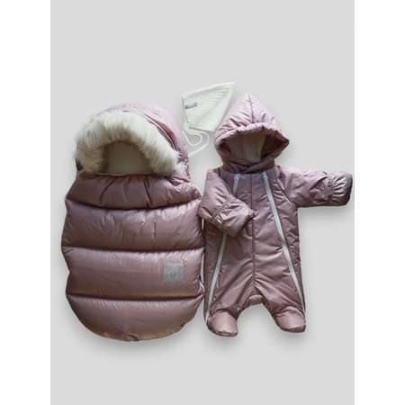В комплект входит: утепленный конверт, комбинезон с двумя удобными молниями до ножек и вязаная шапочка, которая дополнит образ.