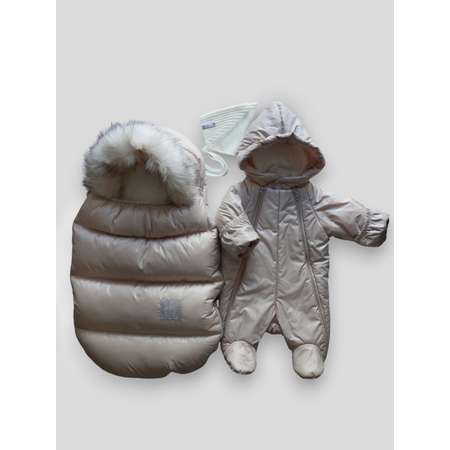 В комплект входит: утепленный конверт, комбинезон с двумя удобными молниями до ножек и вязаная шапочка, которая дополнит образ.