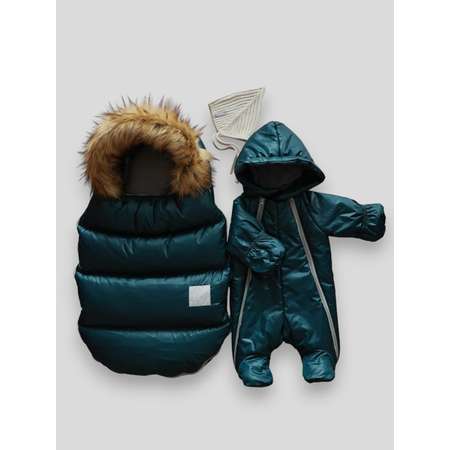 В комплект входит: утепленный конверт, комбинезон с двумя удобными молниями до ножек и вязаная шапочка, которая дополнит образ.