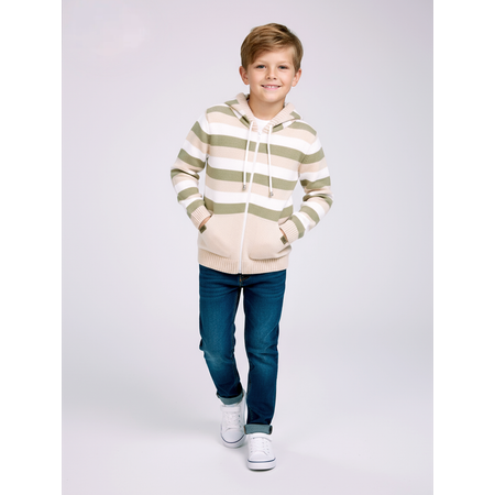 Изделие с уютным капюшоном на шнурке, застежкой-молнией спереди. Данная модель представляет собой стильный жакет на молнии для девочек и мальчиков. На рукавах манжеты вывязаны резинкой. Украшен кардиган рельефной вязкой. Гармоничное сочетание сдержанных цветов придает особый стиль этой вещи.