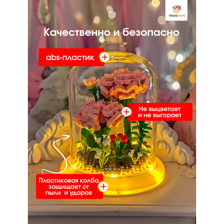 Цветы в прозрачной колбе придают изделию особую привлекательность и создают уютную атмосферу. Конструкторы с подсветкой идеально подходят для творчества и развития мелкой моторики у детей. Благодаря простому и понятному процессу сборки, ребенок сможет самостоятельно собрать красивый ночники из миниблоков. Светильник из 3D конструктора можно использовать как дополнительное освещение или мягкую подсветку.