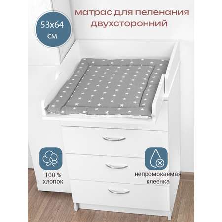 Мягкий матрасик для пеленания и переодевания, гигиенических процедур, принятия воздушных ванн, подготовки к купанию или массажу предназначен для детей с рождения 0+. Размер 53х64 см, по нормам ГОСТ допускается погрешность в длине и ширине изделия +/-5 см. Водонепроницаемое покрытие прямоугольной формы состоит из наполнителя - холкон 35 мм., плотной медицинской клеенки с одной стороны, 100 % хлопок -бязь с другой. Чехол на матрасе двухсторонний , с одной стороны непромокаемая клеенка, с другой ткань ( 100 % хлопок, бязь). Пеленальный матрас (толщина 2,5 см) по размеру подходит для размещения на детском комоде шириной 60 см. Легкая накладка - пеленальник может располагаться на любой горизонтальной поверхности: на столе, обычном комоде, тумбе, родительской кровати, диване или другой удобной мебели. В отличие от пеленального комодика накладка удобна для переноски. Портативный матрац с водонепроницаемым покрытием удобно использовать для смены памперсов или подгузников новорожденному или младенцу. Практичное изделие предназначено для новорожденых, малышей с рождения и детей до годика. Аксессуар из мягкого материала с защитной клеенкой можно использовать как дорожный матрас, удобный коврик для крохи, брать его с собой в поездки и путешествия на автомобиле. Располагая ребенка на матрасике, обращайте внимание на необходимость защиты в виде бортиков или контролируйте его нахождение неотрывно. Изделие сертифицировано в соответствии со стандартами качества, гипоаллергенно, в нем отсутствуют токсичные вещества, оно безопасно для детской кожи. Компактный матрасик легок и прост в уходе и чистке, его достаточно протирать тряпочкой с мыльным раствором и сушить естественным способом или вытирать. Для избежания деформации, рекомендуется ручная стирка, ручной отжим. Сушить матрасик после стирки на горизонтальной поверхности! Произведено в России.