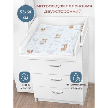 Мягкий матрасик для пеленания и переодевания, гигиенических процедур, принятия воздушных ванн, подготовки к купанию или массажу предназначен для детей с рождения 0+. Размер 53х64 см, по нормам ГОСТ допускается погрешность в длине и ширине изделия +/-5 см. Водонепроницаемое покрытие прямоугольной формы состоит из наполнителя - холкон 35 мм., плотной медицинской клеенки с одной стороны, 100 % хлопок -бязь с другой. Чехол на матрасе двухсторонний , с одной стороны непромокаемая клеенка, с другой ткань ( 100 % хлопок, бязь). Пеленальный матрас (толщина 2,5 см) по размеру подходит для размещения на детском комоде шириной 60 см. Легкая накладка - пеленальник может располагаться на любой горизонтальной поверхности: на столе, обычном комоде, тумбе, родительской кровати, диване или другой удобной мебели. В отличие от пеленального комодика накладка удобна для переноски. Портативный матрац с водонепроницаемым покрытием удобно использовать для смены памперсов или подгузников новорожденному или младенцу. Практичное изделие предназначено для новорожденых, малышей с рождения и детей до годика. Аксессуар из мягкого материала с защитной клеенкой можно использовать как дорожный матрас, удобный коврик для крохи, брать его с собой в поездки и путешествия на автомобиле. Располагая ребенка на матрасике, обращайте внимание на необходимость защиты в виде бортиков или контролируйте его нахождение неотрывно. Изделие сертифицировано в соответствии со стандартами качества, гипоаллергенно, в нем отсутствуют токсичные вещества, оно безопасно для детской кожи. Компактный матрасик легок и прост в уходе и чистке, его достаточно протирать тряпочкой с мыльным раствором и сушить естественным способом или вытирать. Для избежания деформации, рекомендуется ручная стирка, ручной отжим. Сушить матрасик после стирки на горизонтальной поверхности! Произведено в России.