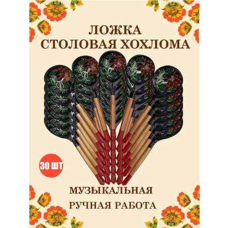 Ложка деревянная средняя Хохлома Оптом музыкальная Рябина зеленые листья- 30 шт.