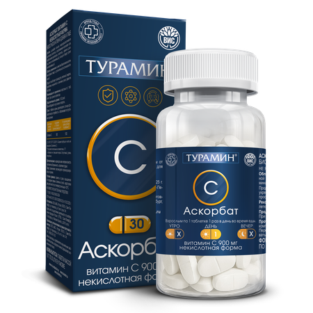 Турамин АСКОРБАТ – источник витамина С в некислотной форме, безопасной для слизистой желудка. В 1 таблетке содержится 900 мг витамина С (аскорбиновой кислоты), что составляет 1500% от рекомендуемого уровня суточного потребления (не превышает верхнего допустимого уровня потребления). 1 упаковки Турамин Аскорбат достаточно на минимальный курс применения. В Турамин АСКОРБАТ используется сырье аскорбата кальция: соль кальция становится источником кальция для организма, а также не оказывает влияния на уровень натрия в крови (в отличие от соединений с натрием) и предупреждает риски сердечно-сосудистых заболеваний.