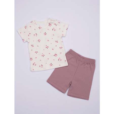 Комплект одежды из трикотажного полотна - интерлок в рубчик. Легкая футболочка с короткими рукавами и застежкой в плече. Удобные шорты без боковых швов.