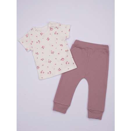 Комплект одежды из трикотажного полотна - интерлок в рубчик. Легкая футболочка с короткими рукавами и застежкой в плече. Удобные шорты без боковых швов.