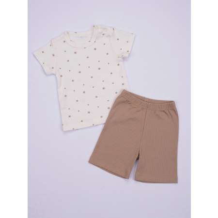 Комплект одежды из трикотажного полотна - интерлок в рубчик. Легкая футболочка с короткими рукавами и застежкой в плече. Удобные шорты без боковых швов.